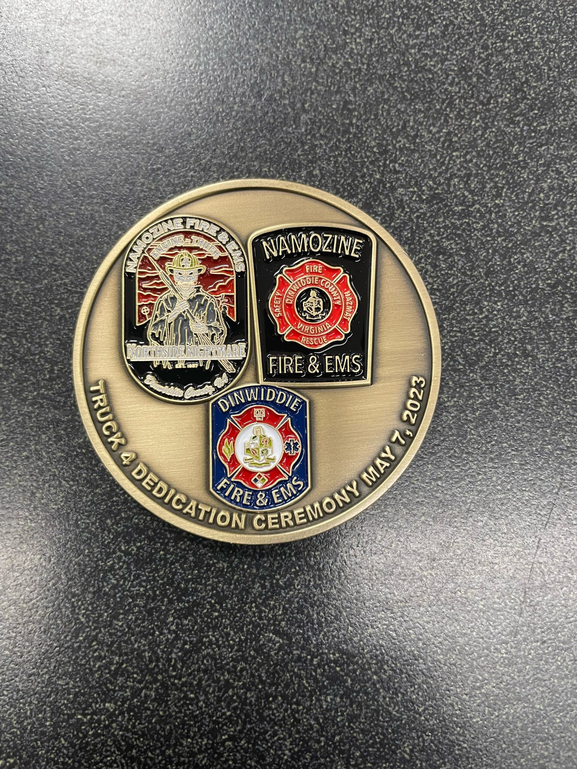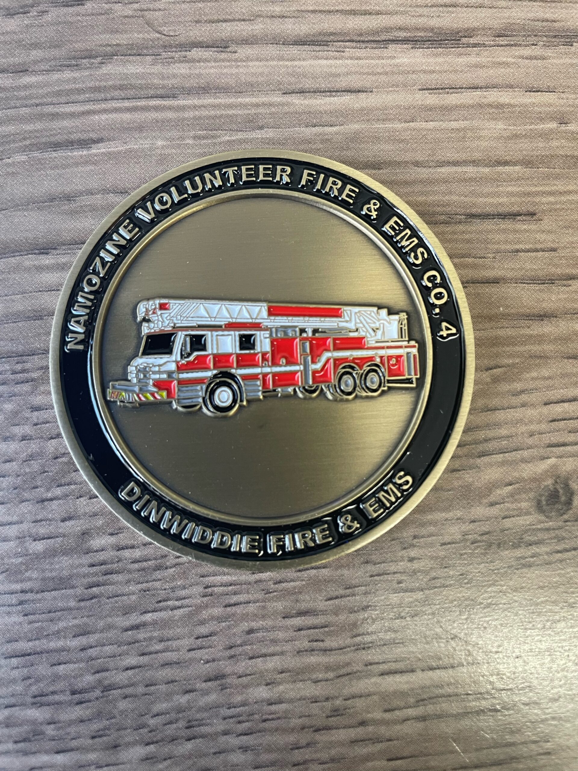 Flip the coin to discover a beautifully rendered combination of the Namozine Volunteer Fire Department’s company and pride patches, alongside the Dinwiddie Fire & EMS patch. This side represents a unity of purpose and a shared dedication to protecting and serving our community.