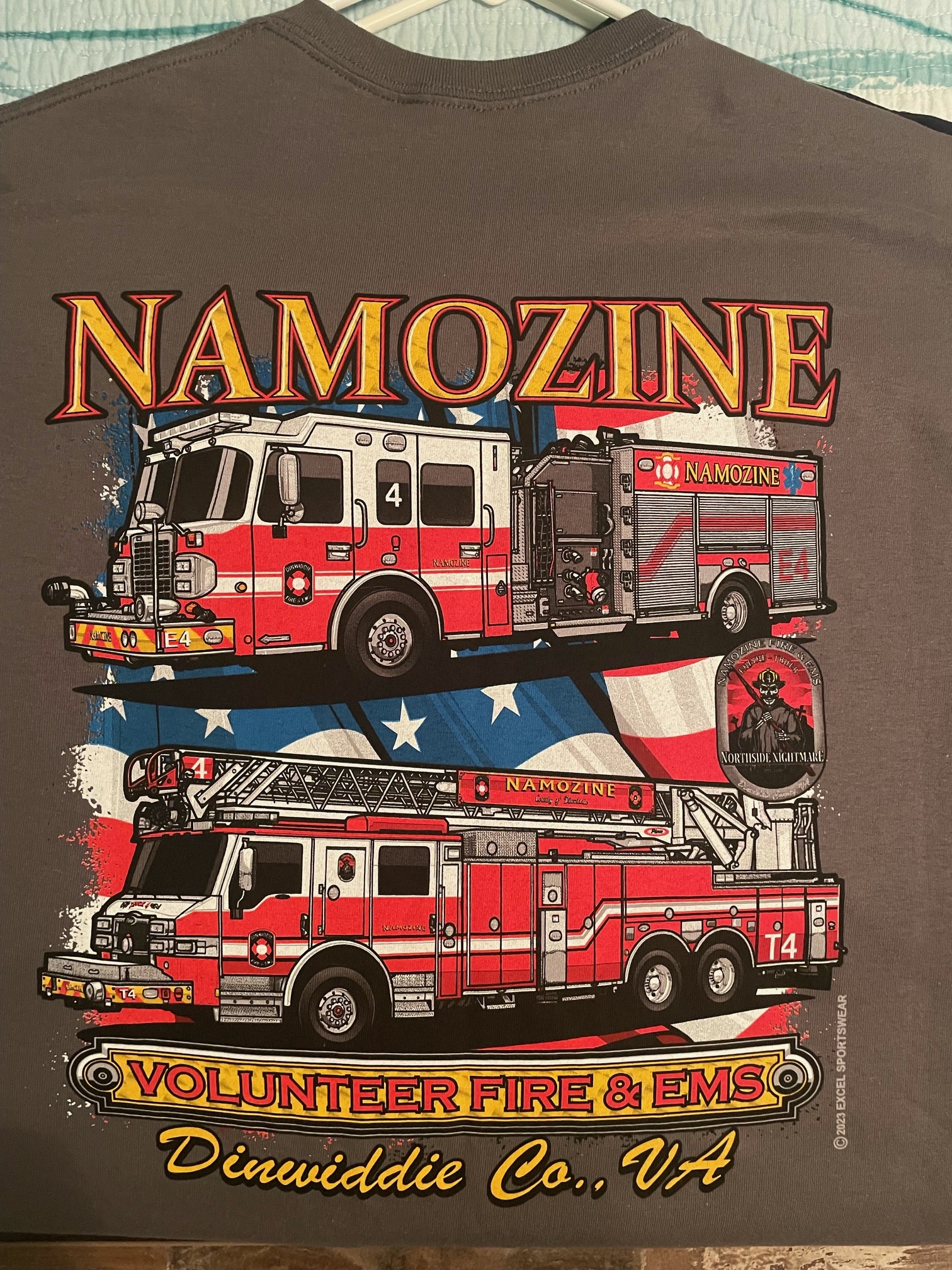 Step out in distinctive style with the Namozine Volunteer Fire Department’s grey Truck 4/Engine 4 Department T-shirts. These grey T-shirts are not just apparel; they’re a statement of support and admiration for our firefighting heroes. Made with quality, comfortable grey fabric, they promise both longevity and wearability. The front is elegantly embellished with the classic Namozine VFD patch, symbolizing the dedication and heroism of our team. The back features a dynamic, detailed graphic of Truck 4 and Engine 4, showcasing the power and preparedness of our emergency services. These grey T-shirts are ideal for anyone connected to the NVFD — whether you’re a member, a family member, or a proud supporter. They are also a fantastic choice for those with an interest in firefighting and emergency response vehicles. By wearing this T-shirt, you’re not just showing off a stylish piece of clothing; you’re also contributing to the NVFD, with proceeds supporting our vital operations. Display your NVFD pride and be part of our community’s story with these unique and meaningful grey T-shirts.